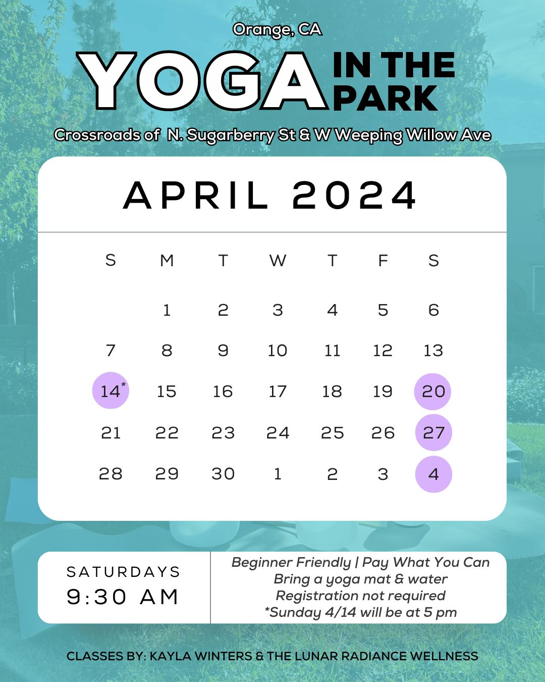Thanks for being a part of our Yoga in the Park Family. Here is our April 2024 calendar. I want to highlight that on the weekend of April 13th, we will be having class on Sunday, April 14th at 5 pm instead of Saturday, April 13th.